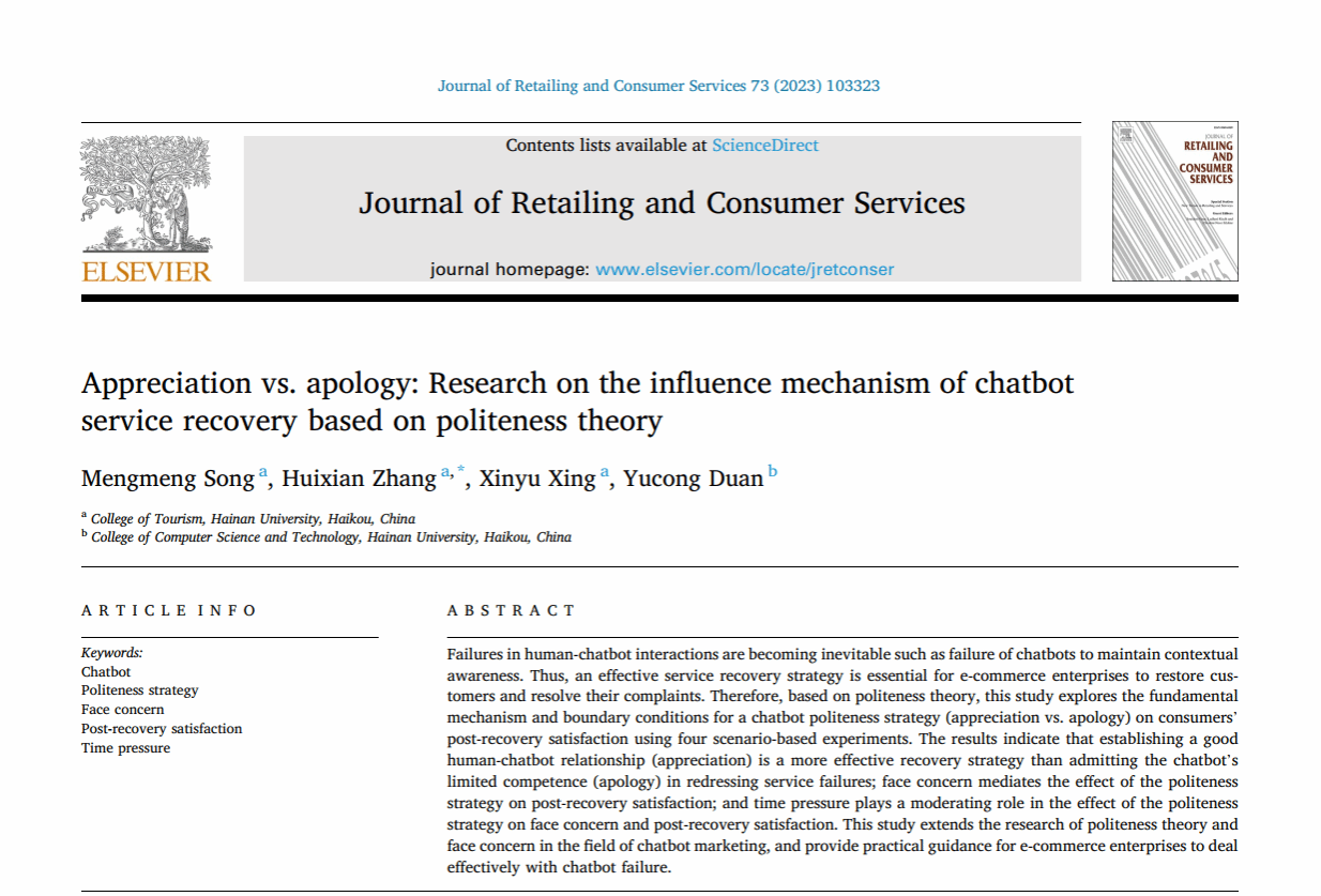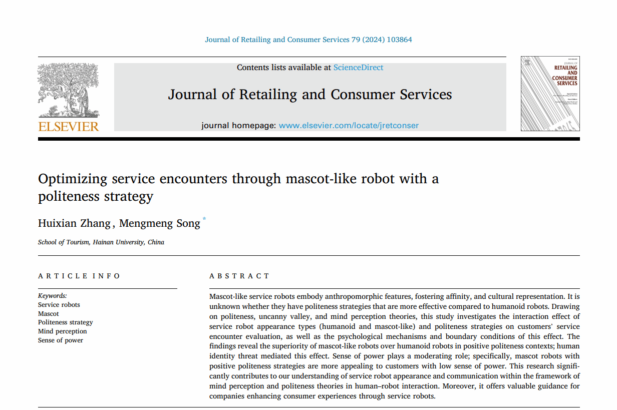 关于服务机器人的论文“Optimizing service encounters through mascot-like robot with a politeness strategy”于2024年4月在线发表,第一作者为硕士生张慧娴,通讯作者为宋蒙蒙副教授。关于在线聊天机器人的论文“Appreciation vs. apology: Research on the influence mechanism of chatbot service recovery based on politeness theory”于2023年7月发表,第一作者为宋蒙蒙副教授,通讯作者为硕士生张慧娴。两篇论文均以永利集团为唯一署名单位。