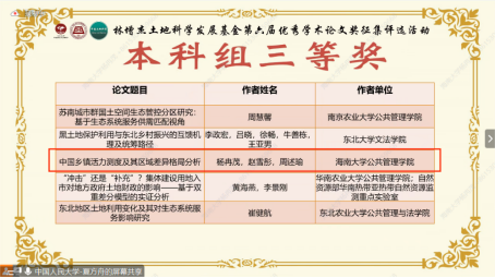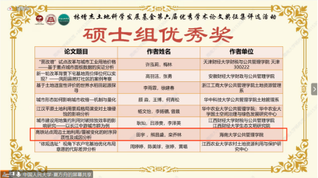 2023年6月25日,由中国人民大学公共管理学院、林增杰土地科学发展基金与《中国土地科学》编辑部共同主办的“林增杰土地科学发展基金第六届优秀学术论文奖征集评选活动”成功举办。在永利集团公共管理学院熊昌盛研究员的指导下,该学院2020级本科生杨冉茂、赵雪彤、周述瑜三位同学以《中国乡镇活力测度及其区域差异格局分析》获本科组三等奖,2021级硕士研究生田宇同学以《高铁站点周边土地利用/覆被变化的时序异质性及成因分析》获硕士组优秀奖。