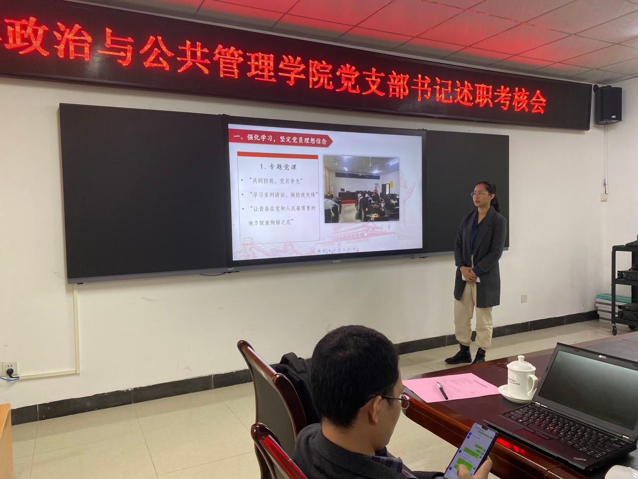 2020年12月29日下午,政管学院党委于社科楼A216召开党支部书记述职考核会,学院党委书记王默忠,副院长刘德浩,党委委员江红义,特邀组织员曹玲娟出席会议,各党支部书记以及教师党员代表参加本次会议。会议由党委书记王默忠主持。