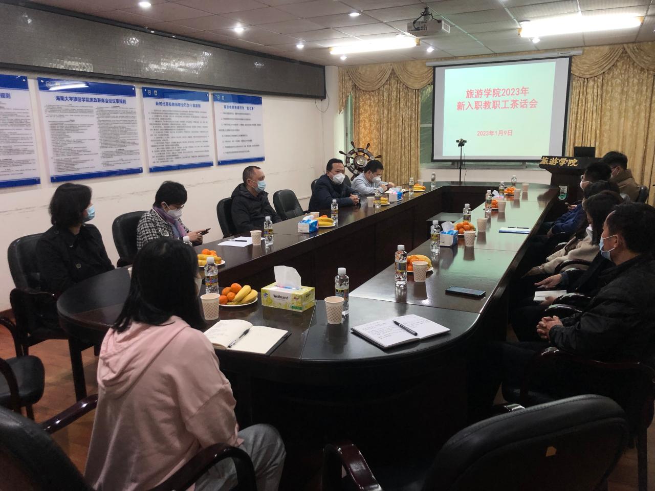 2023年1月9日下午,在8-205会议室,我院召开新进教职工茶话会,院长郭强、党委书记韩力光、副院长何彪、张珊、刘雪莲(挂职)以及各办负责人、新进教职工出席会议。