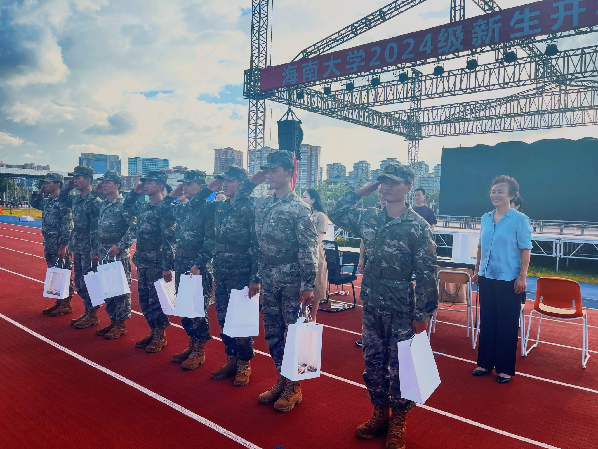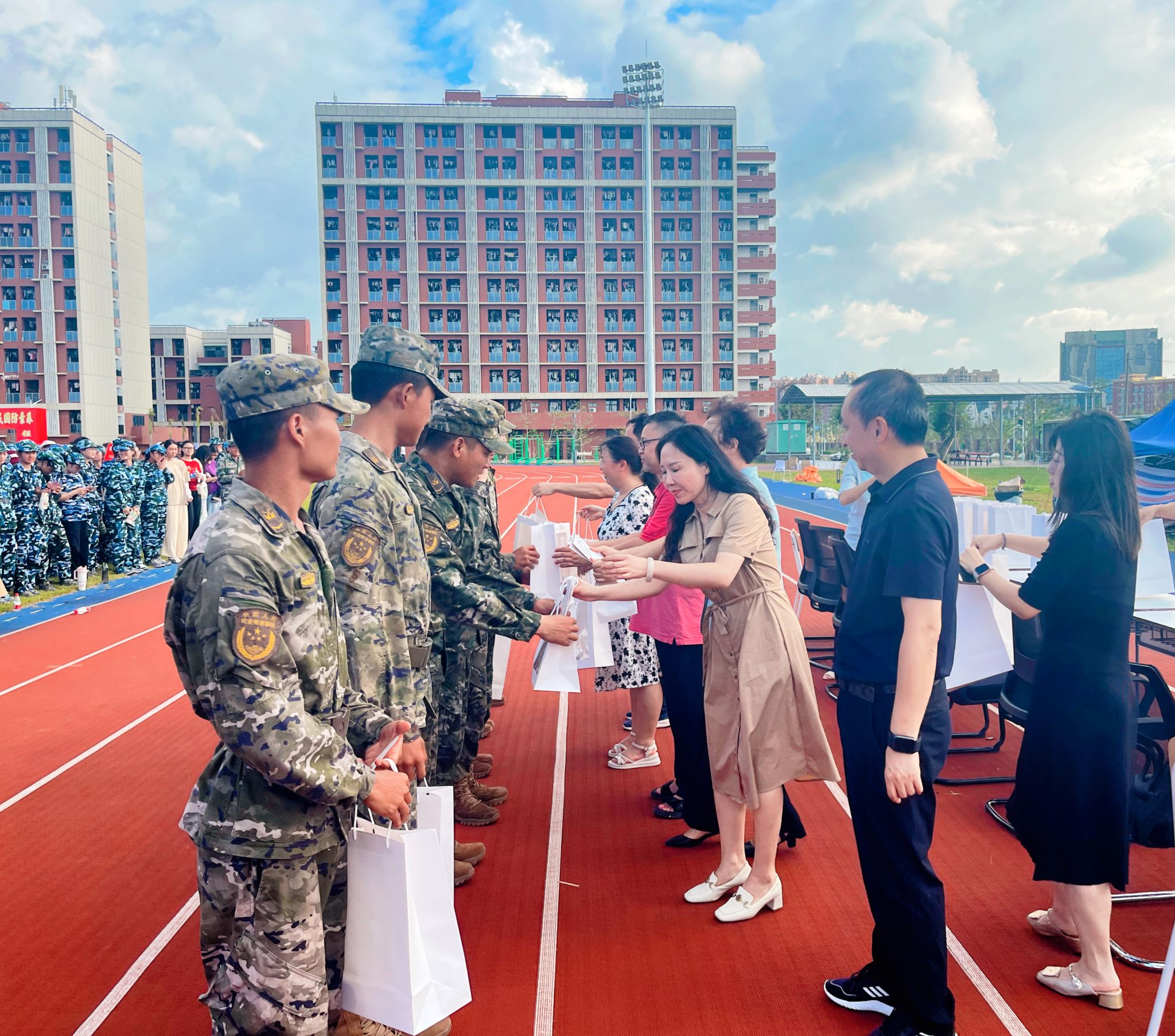 随后,学院领导班子向教官与新生发放了军训慰问品,传达了学院的温暖与关怀,学生们对领导们的到来感到非常惊喜和感动,他们纷纷表达了对学院的感激之情。现场洋溢着温馨和谐的氛围。