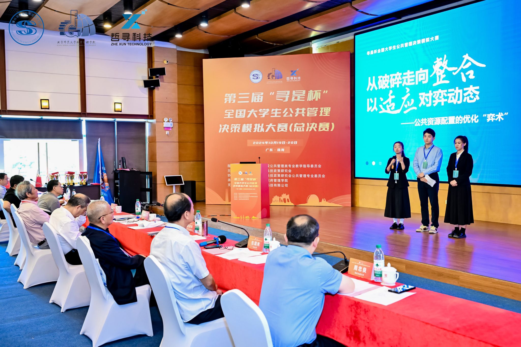 2024年10月19日至20日,由教育部高等学校公共管理类专业教学指导委员会指导,中国科学学与科技政策研究会主办,中国科学学与科技政策研究会公共管理专业委员会协办,北京师范大学政府管理学院、北京师范大学政府治理研究中心承办,上海哲寻信息科技有限公司提供技术支持的第三届“寻是杯”全国大学生公共管理决策模拟大赛(总决赛)在北京师范大学(珠海校区)成功举办。来自全国90所高校的精英队伍,经过激烈的区域赛(西北赛区、西南赛区、华南赛区、华中赛区、华东赛区、华北赛区、东北赛区)选拔,汇聚于此,共同角逐总决赛的荣誉。