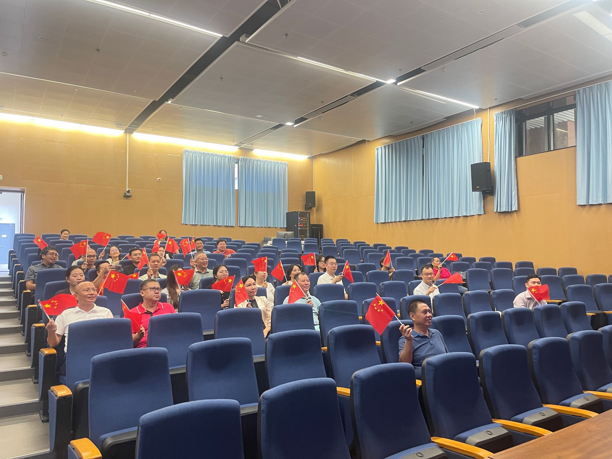 校党委常委、副校长岳文与学院班子成员、各支部党员、教师以及2025级新生在观澜湖校区一起收看直播盛况,同上一堂鲜活生动的爱国主义教育“开学第一课”。人民子弟兵庄严肃穆的军容、铿锵有力的步伐、英武雄壮的气势、精良的各式装备让师生们心潮澎湃、震撼不已,进一步激发了大家的爱国热情与民族自豪感。现场不时响起阵阵掌声。