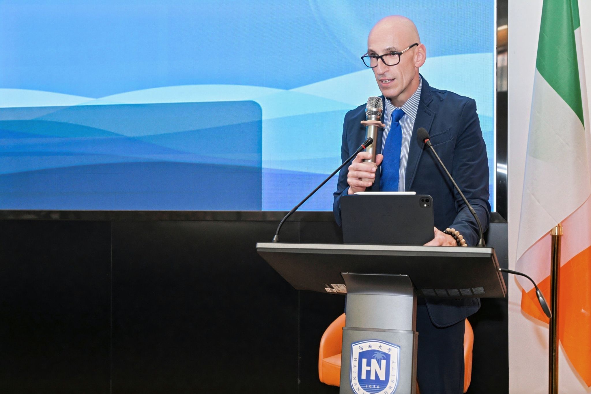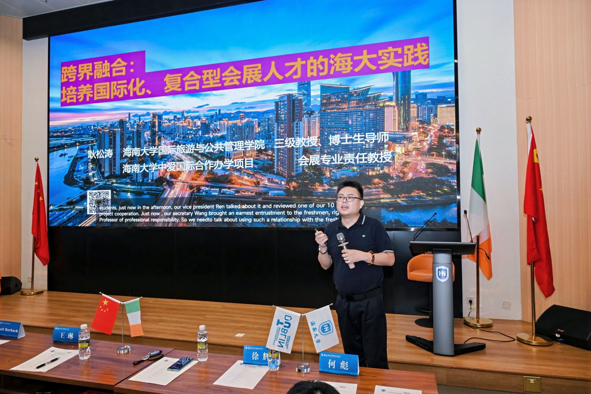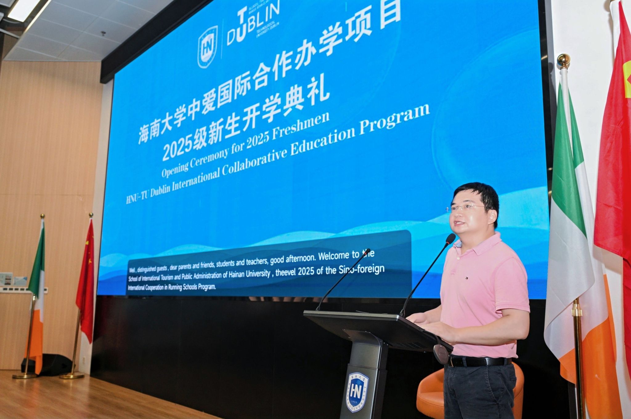 爱尔兰都柏林理工大学旅游与酒店管理学院院长Ralf Burbach首先致辞。他回顾了中爱合作项目十年来的丰硕成果,并对新同学的加入表示祝贺。他鼓励新生充分利用两校优质教育资源,拓展国际视野,成为具有跨文化沟通能力的会展专业人才。