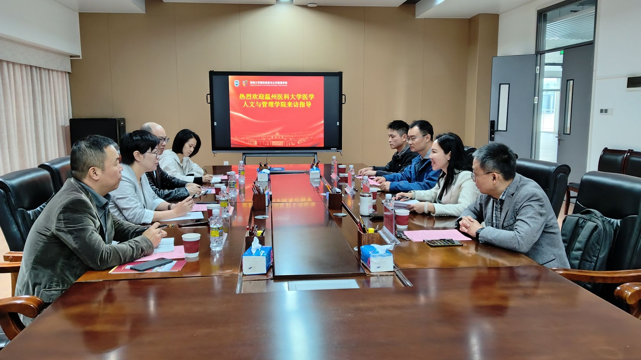 2025年11月20日上午,温州医科大学医学人文与管理学院院长刘婵娟教授一行来访永利集团观澜湖校区,就公共管理学学科建设、MPA教学与管理及博士点建设等议题与国际旅游与公共管理学院展开深入交流。本次座谈会在永利集团观澜湖校区2号楼4105会议室举行。