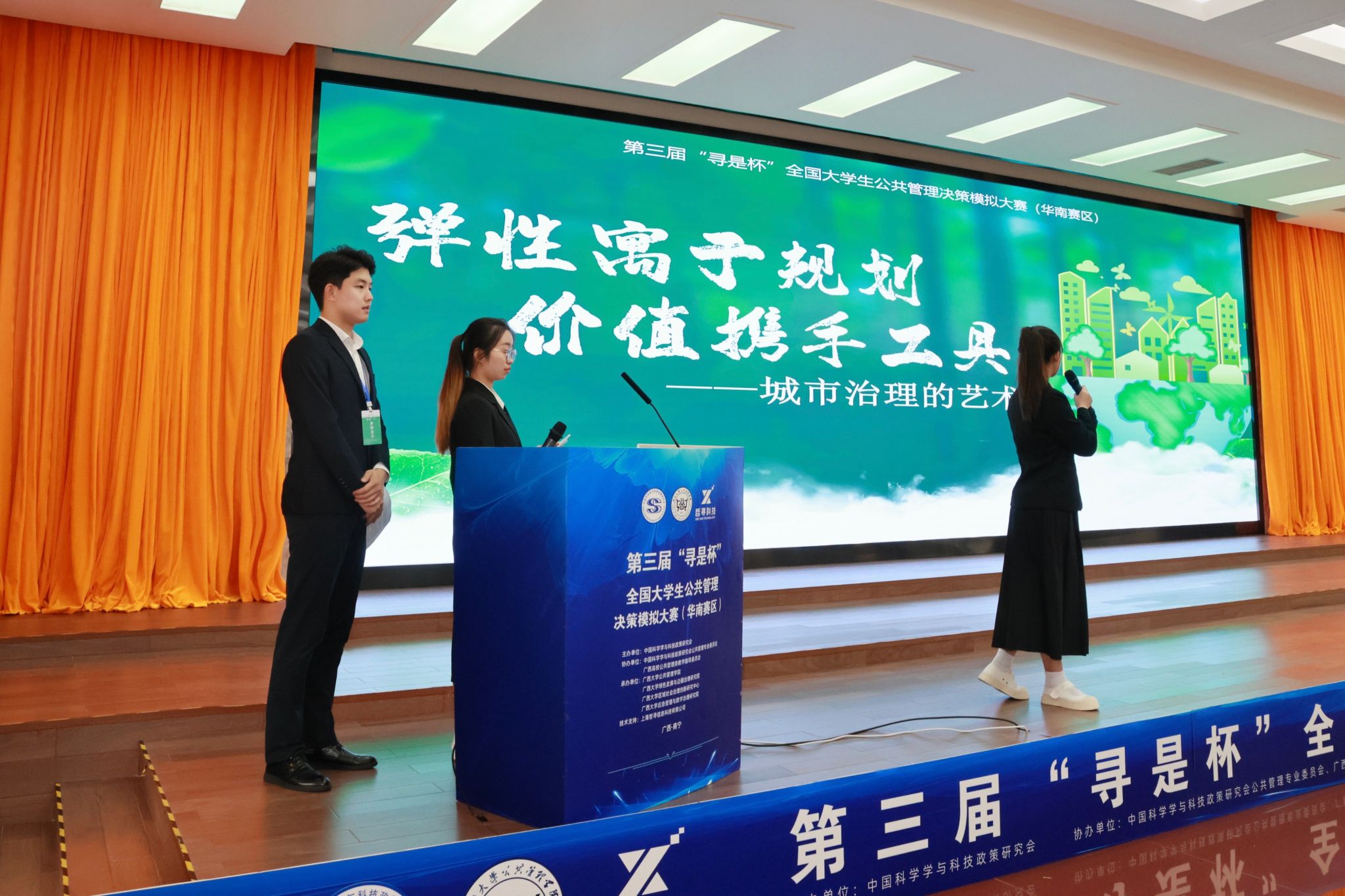 我校派出“齐心同誉”团队参赛。该团队由我院行政管理专业2020级武子淇、2021级朱桐以及2022级胡潇毓三位本科生组成,在徐艳晴老师和魏诗强老师的精心指导下,经过赛前的艰苦训练和积极备赛,不仅以建言者身份提交了精心的方案设计,还从治理者视角进行了模拟决策。在公共管理方案设计与决策演练沙盘对抗环节表现出色,以小组第二名的身份晋级决赛答辩。