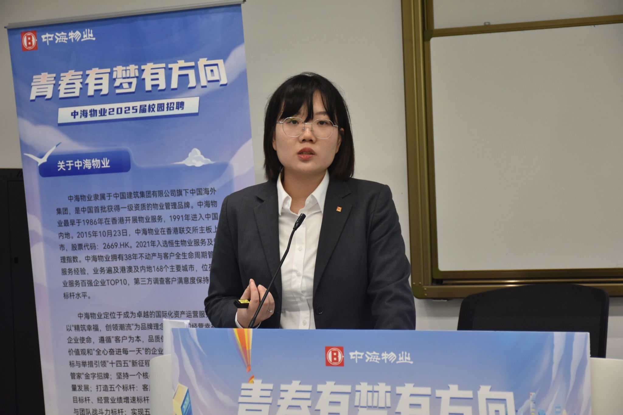 集团副总何承就如何挑选一家好的企业与学生们作交流。她认为,好的企业首先看其所属的行业是否有较大社会需求,是否是朝阳行业;第二,看企业文化与工作氛围是否活跃;第三,看企业能否为员工提供发展空间和成长路径。任建兴总经理认为“好工作是干出来的”,希望毕业生要培养正确的择业观,认清自身优势,敢于尝试,不怕吃苦。人事行政部经理靳兰兰以“青春有梦有方向”为主题进行宣讲。她分析了往届生需求以及2025届毕业生现状,指出就业形势将愈发严峻,提醒同学们要珍惜在校时光,注重储备行业知识,增强实践能力,增加实习经验,提升就业竞争力。靳兰兰经理根据自己多年的校招经验,向同学们梳理了大学生求职时间表和求职平台,提醒同学们找工作是一场马拉松,早准备,早胜出。接着,靳兰兰经理介绍了中海物业集团的发展历程、企业文化、业务范围等基本情况,详细阐述了公司管培生计划。中海物业设有完善的“1358”专属成长计划培训体系和晋升机制,为实习生的未来发展提供有力保障。